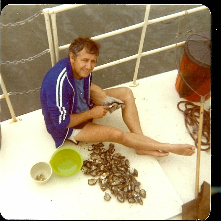 Dad shelling the oysters on a houseboat on the Hawkesbury River.